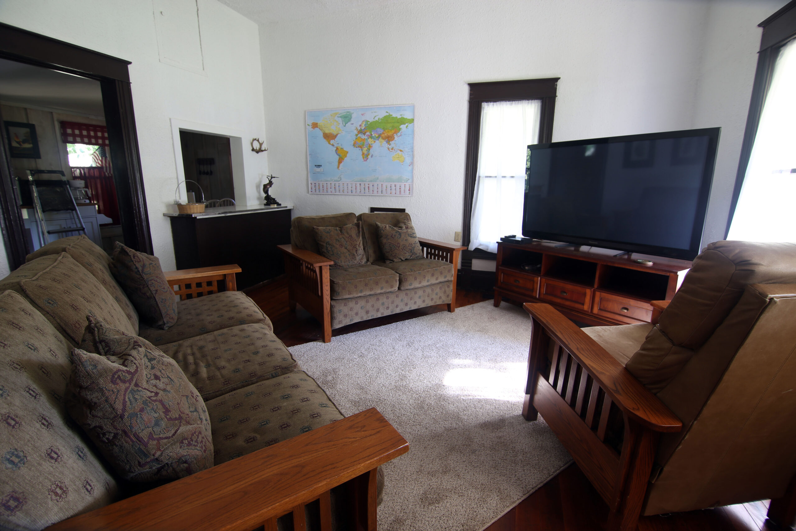 High ceilings and the original, pine hard-wood floors make the living room a great place to watch TV, play a game or reminisce about the day.